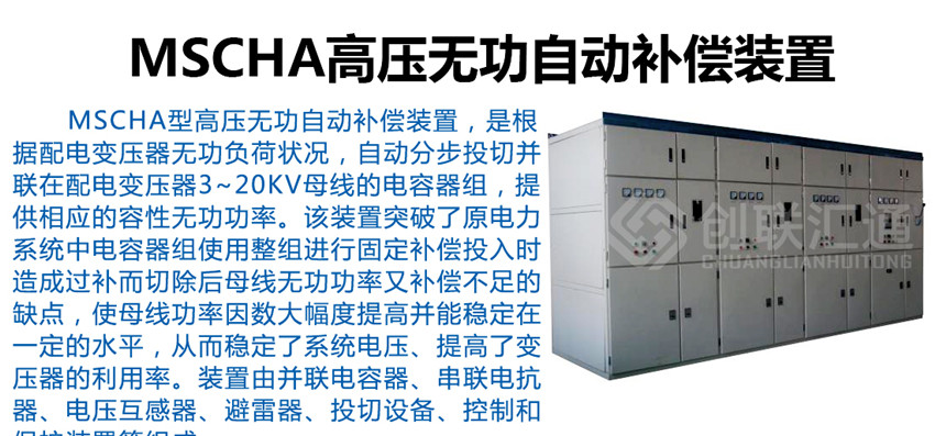 MSCHA型高壓無功自動補償裝置,是根據(jù)配電變壓器無功負荷狀況,自動分步投切并聯(lián)在配電變壓器3~20kV母線的電容器組,提供相應(yīng)的容性無功功率。該裝置突破了原電力系統(tǒng)中電容器組使用整組進行固定補償投入時造成過補而切除后母線無功功率又補償不足的缺點,使母線功率因數(shù)大幅度提高并能穩(wěn)定在一定的水平,從而穩(wěn)定了系統(tǒng)電壓、提高了變壓器的利用率。裝置由并聯(lián)電容器、串聯(lián)電抗器、電壓互感器、避雷器、投切設(shè)備、控制和保護裝置等組成。